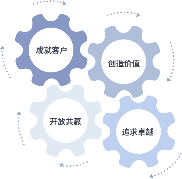 成就客户是一切决策的出发点,,,创造价值是衡量所有工作的标准,,,追求卓越是我们做事做人的态度,,,开放共赢是我们的格局也是最终的结果。。价值观的齿轮环环相扣,,推动着组织里的每个人不断向前。。。。