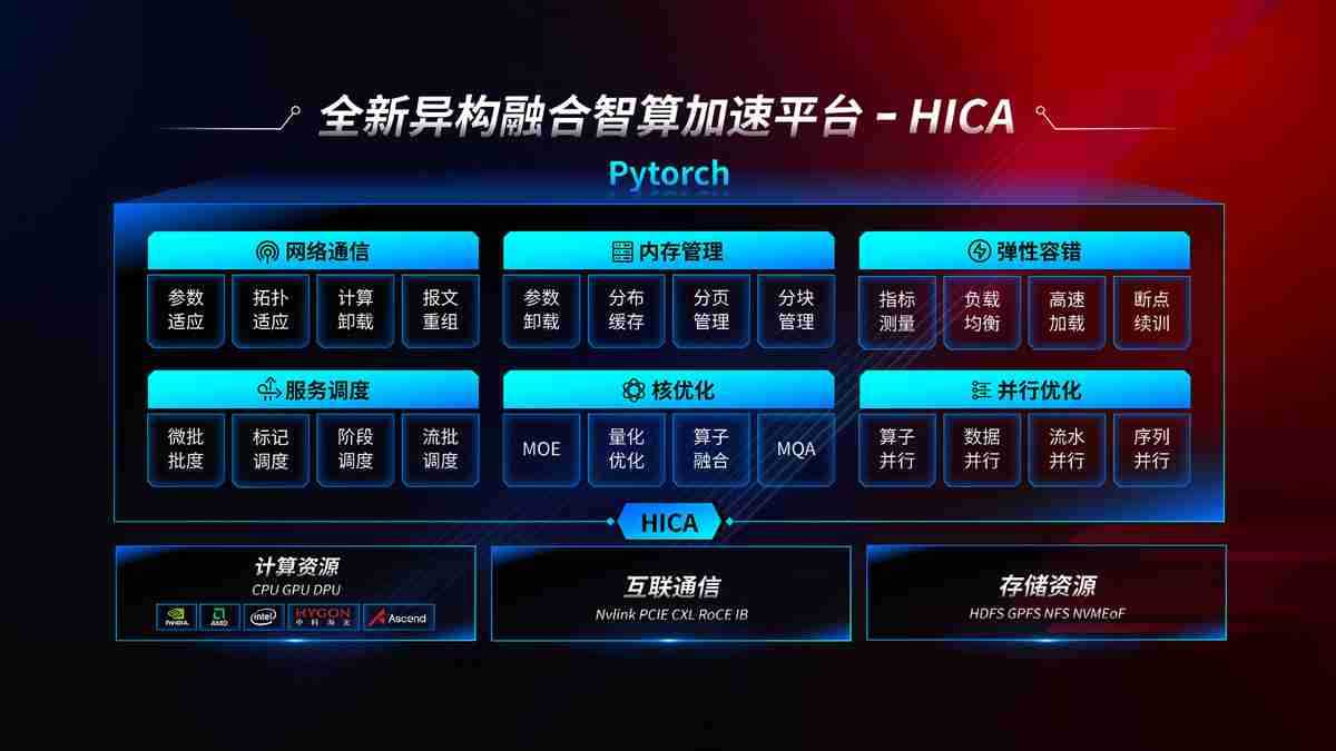 通过自研的服务层、、中间适配层、、以及调度编排算法,,采用数据并行、、、模型并行等多种并行方式,,把并行计算任务进行有效的分解,,,,使其分别由相应的软件栈和算力资源来承接。。当GPU资源变化,,,,HICA可以实时动态调度计算子任务并调整模型拓扑和架构,,以充分聚合各种算力资源。。。