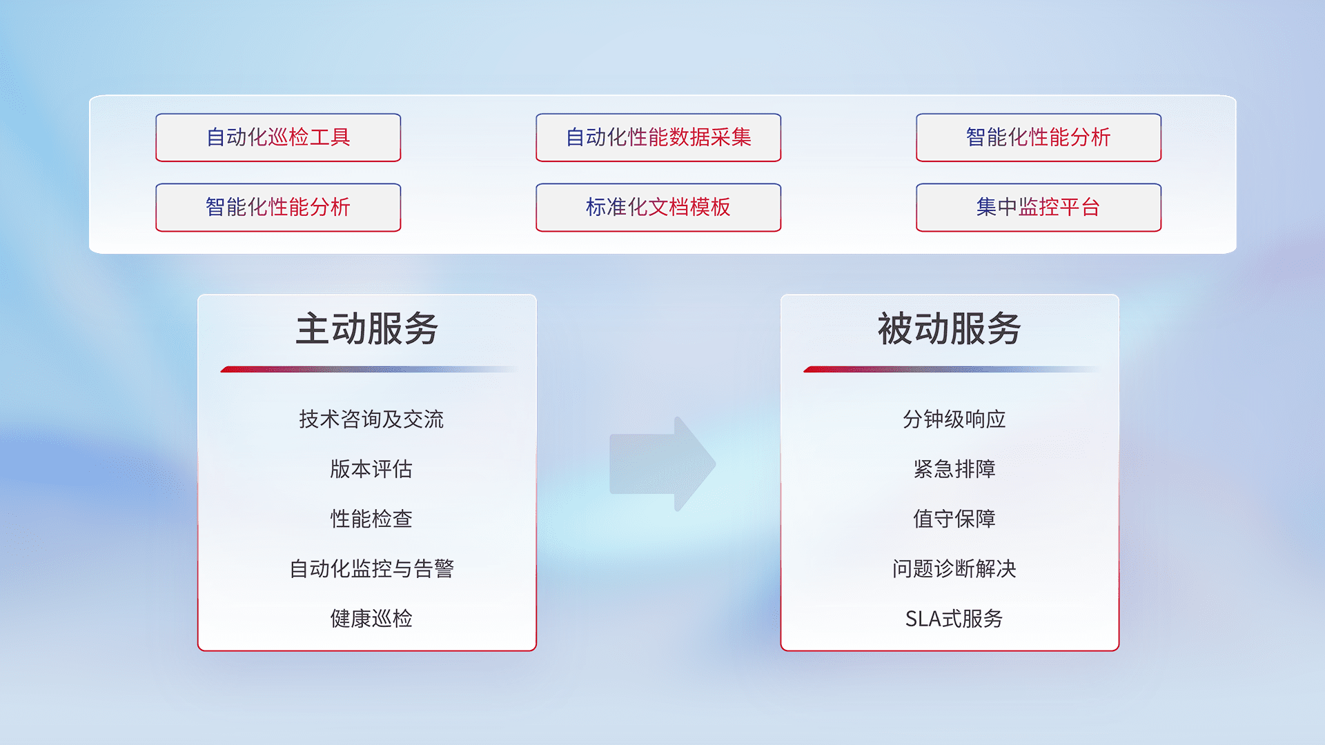 智能化工具和标准化文档,,,保障服务质量,,提供主动服务(包含技术咨询、、、、版本评估、、性能检查、、自动化监控与告警、、健康巡检)和被动服务包含(分钟级响应、、、紧急排障、、、值守保障、、问题诊断解决、、、、SLA服务)。。。