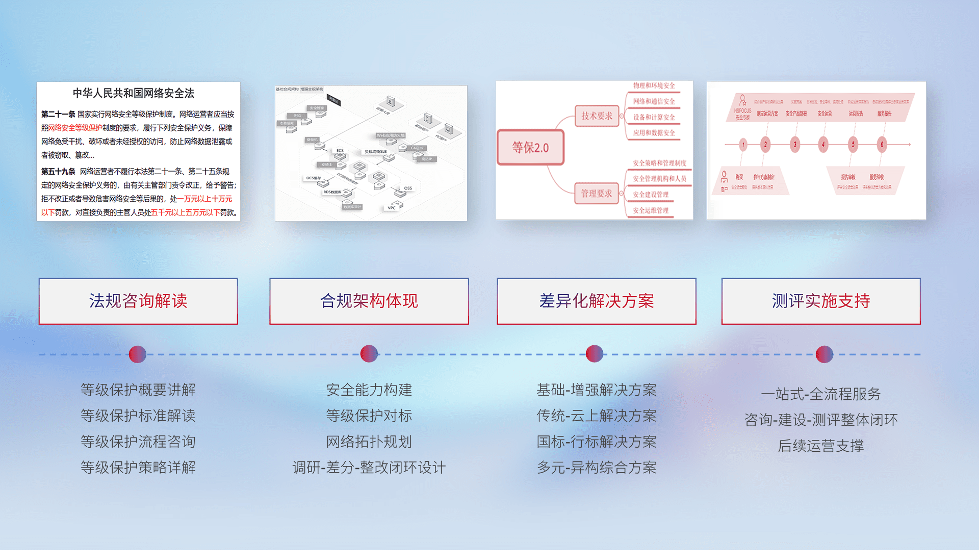 通过专业的法律咨询解读、、、、合规架构体现、、、差异化解决方案、、、、测试实施支持等服务,,,,为客户量身打造等保合规体系。。